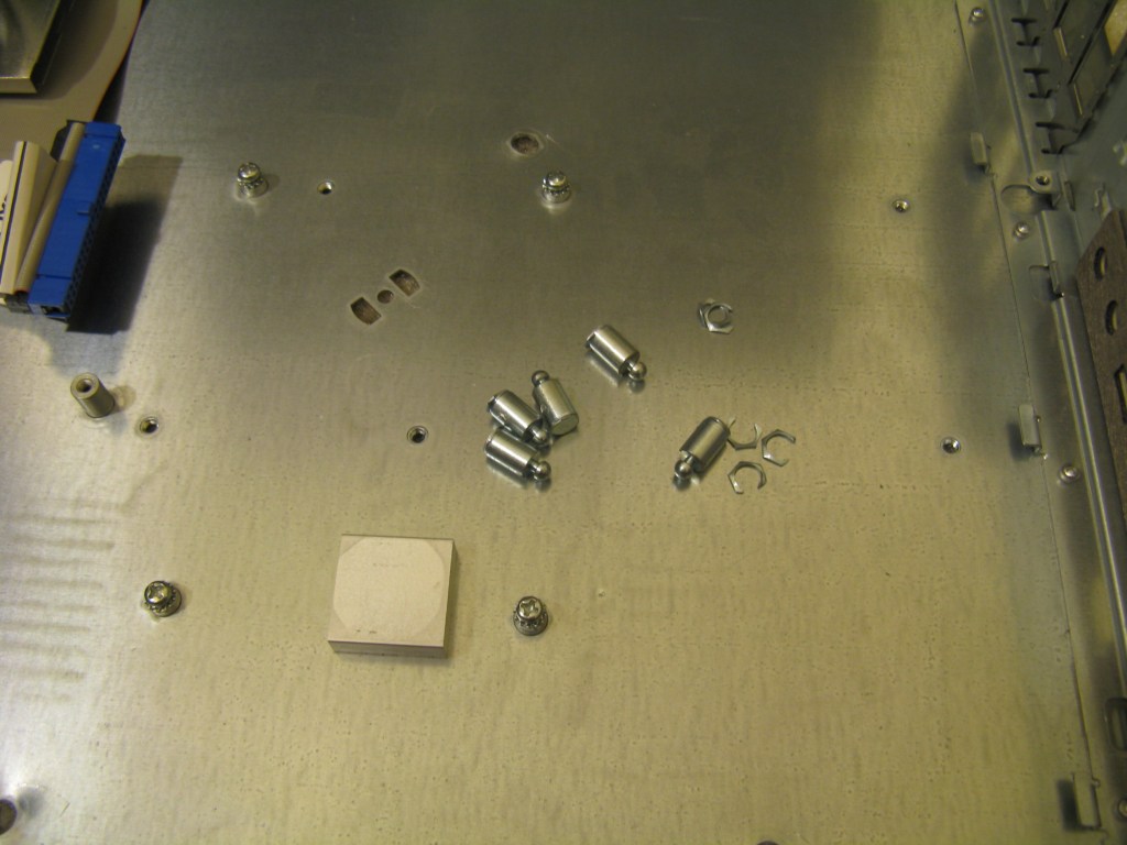 People have used several methods for mounting a new motherboard in a G4. The easiest for me to get was nuts and bolts. The next step is to drill holes for them.