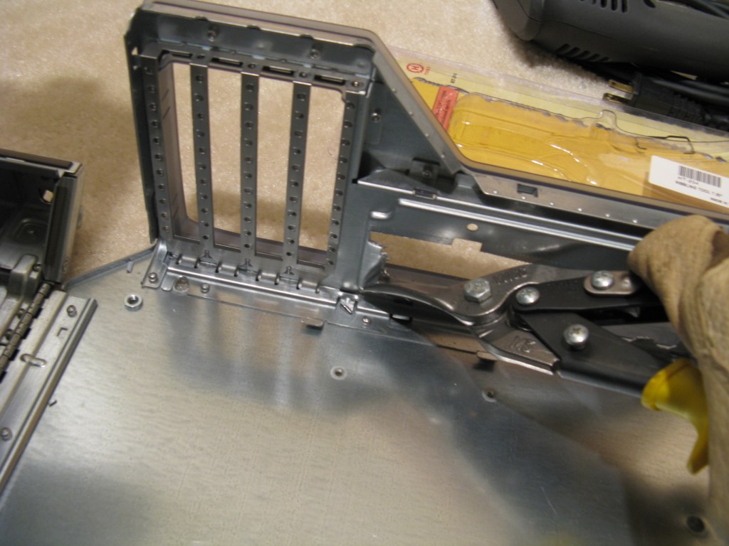 To clear the motherboard, I had to cut a few inches off of the back of the optical drive cage and notch out the shelf that it sits on. I started using metal snips and nibblers, but switched to a jigsaw.