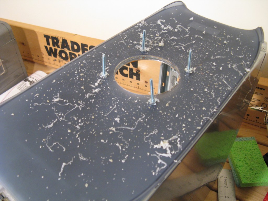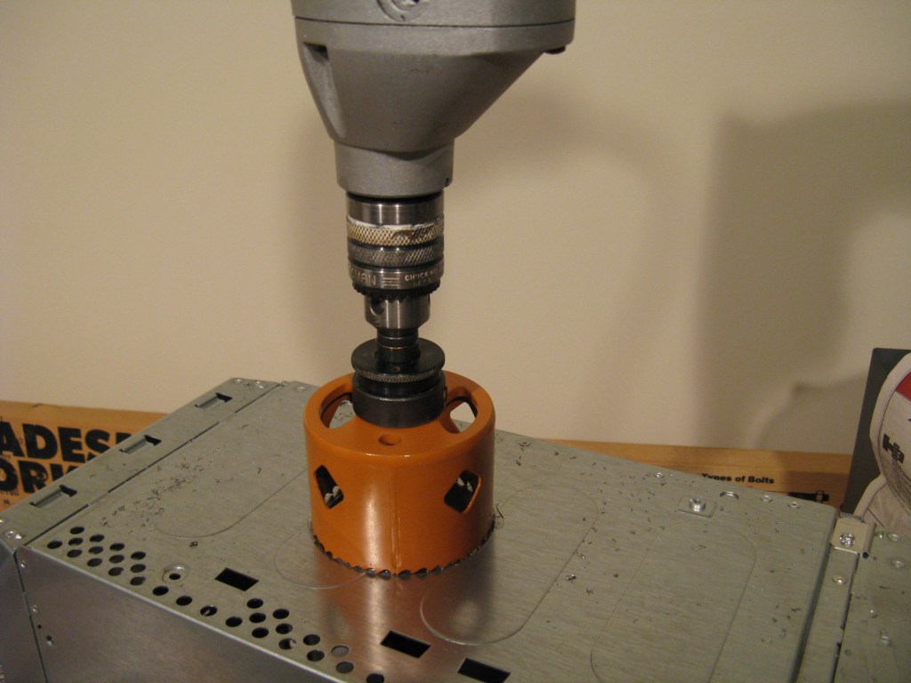 I used a drill with a hole cutting attachment, which made a neat hole that needed only a little filing and sanding to be smooth enough. Then I set the fan dust filter’s frame over the hole and aligned it to the case sides using a carpenter’s square, and drilled the four mounting holes, putting in each screw for alignment after I drilled its hole. It seems best to cut the fan holes with the plastic top in place.