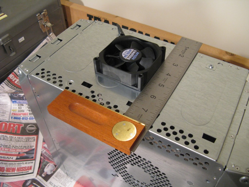 I tried a temperature-controlled 80mm case fan in the top blow hole, but it didn’t spin up to a high enough speed (CPU idled at 60C and CPU fan ran at 2800 RPM). I am currently using a Scythe 120mm fan set to around 1220 RPM. I finally left off the dust filter I had bought because it blocked too much airflow and required the fan to run too loudly. The CPU fan now idles with the case closed barely faster than with the case open (which is around 1400 RPM). The upgraded Intel PowerMac is significantly quieter than when it had the G4 1.4GHz upgrade CPU and stock case fan.