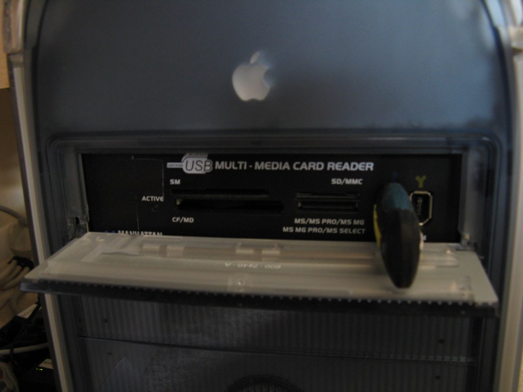 I put a SATA DVD burner in a USB/eSATA enclosure; this motherboard can boot from a USB optical drive. I put a USB/Firewire/flash front ports panel in the computer’s optical drive bay. I had been wanting front ports on the computer anyway, so this was a somewhat elegant solution to two problems at once. The eSATA enclosure is important, as the Apple DVD player only works if you have an ATA or SATA DVD drive installed. I put a SATA to eSATA adapter bracket in the lowest PCI slot.