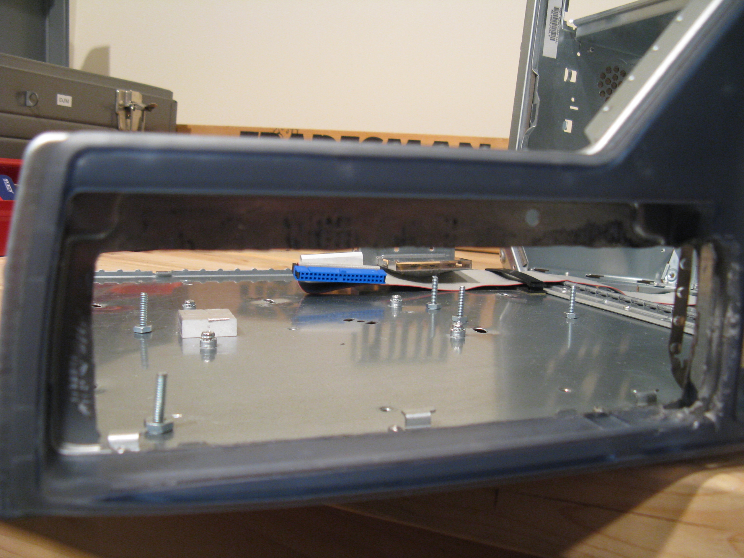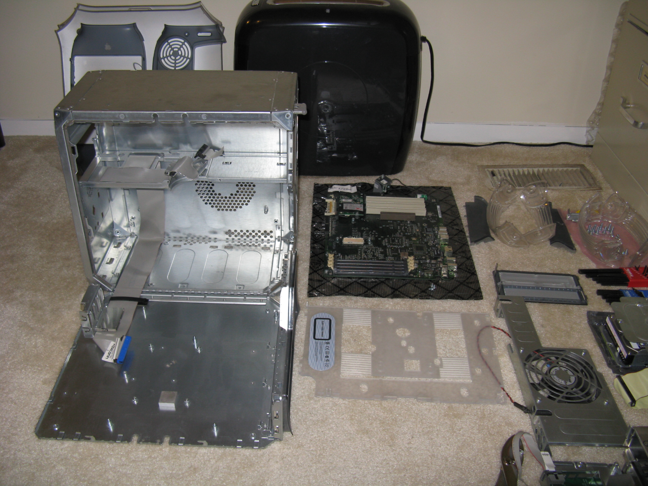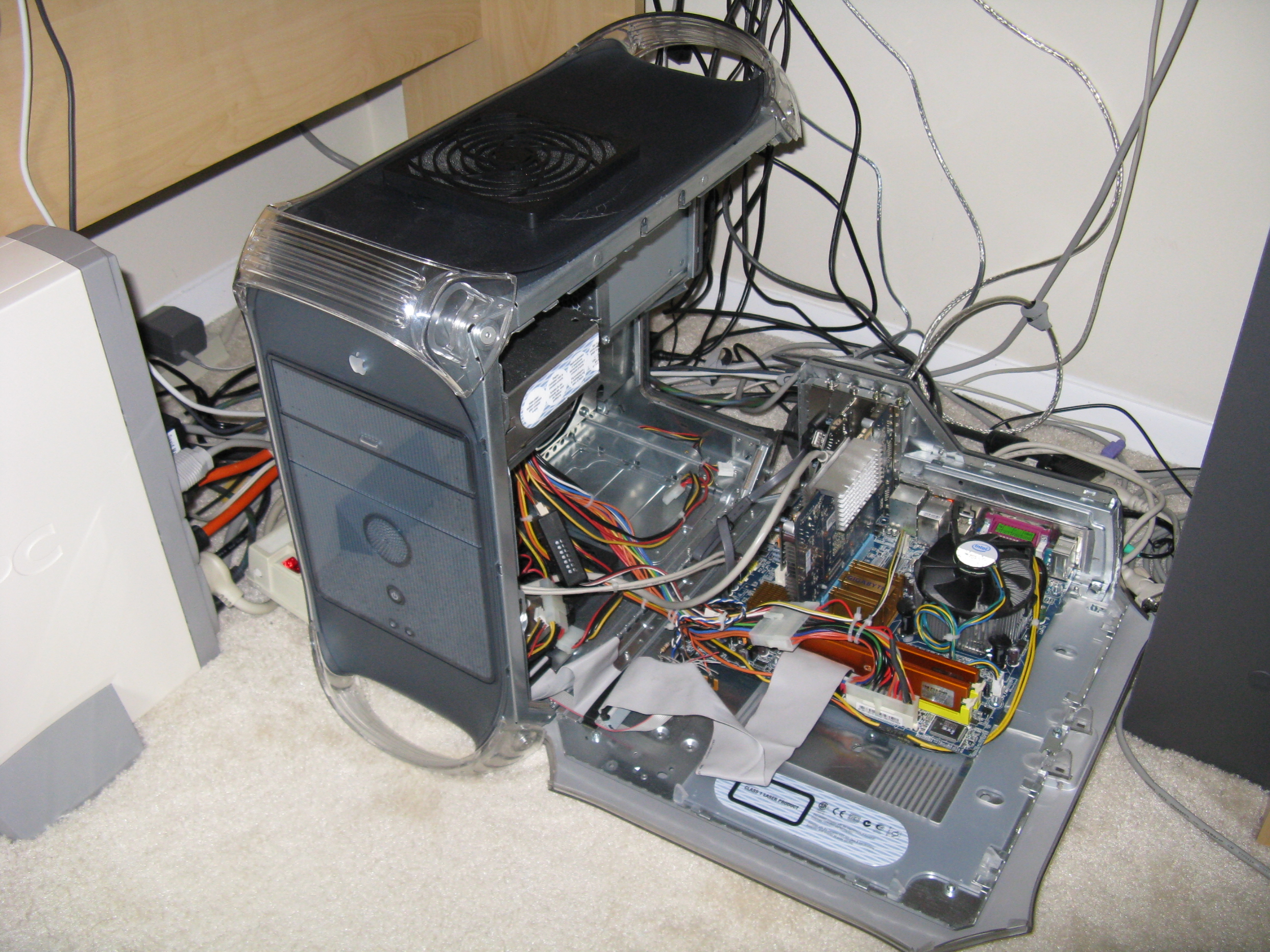 I didn’t have over $1,200 to spend on a new Mac, and the Mac Mini is too underpowered to meet my needs, which include video editing. After some research on the web, I concluded that it was possible to convert my PowerMac G4 to an Intel Core2 Duo, producing the missing link in the Mac lineup. Several people have written up how to do it with pictures, though they had somewhat different tools and parts than I did, so I had to figure some parts out myself. Here is how I did the conversion. I’ve always liked the case used in this generation of PowerMacs. I tried to keep the computer looking as stock as I could, to give a “wolf in sheep’s clothing” effect. In some places that wasn’t possible, as I’ll explain.