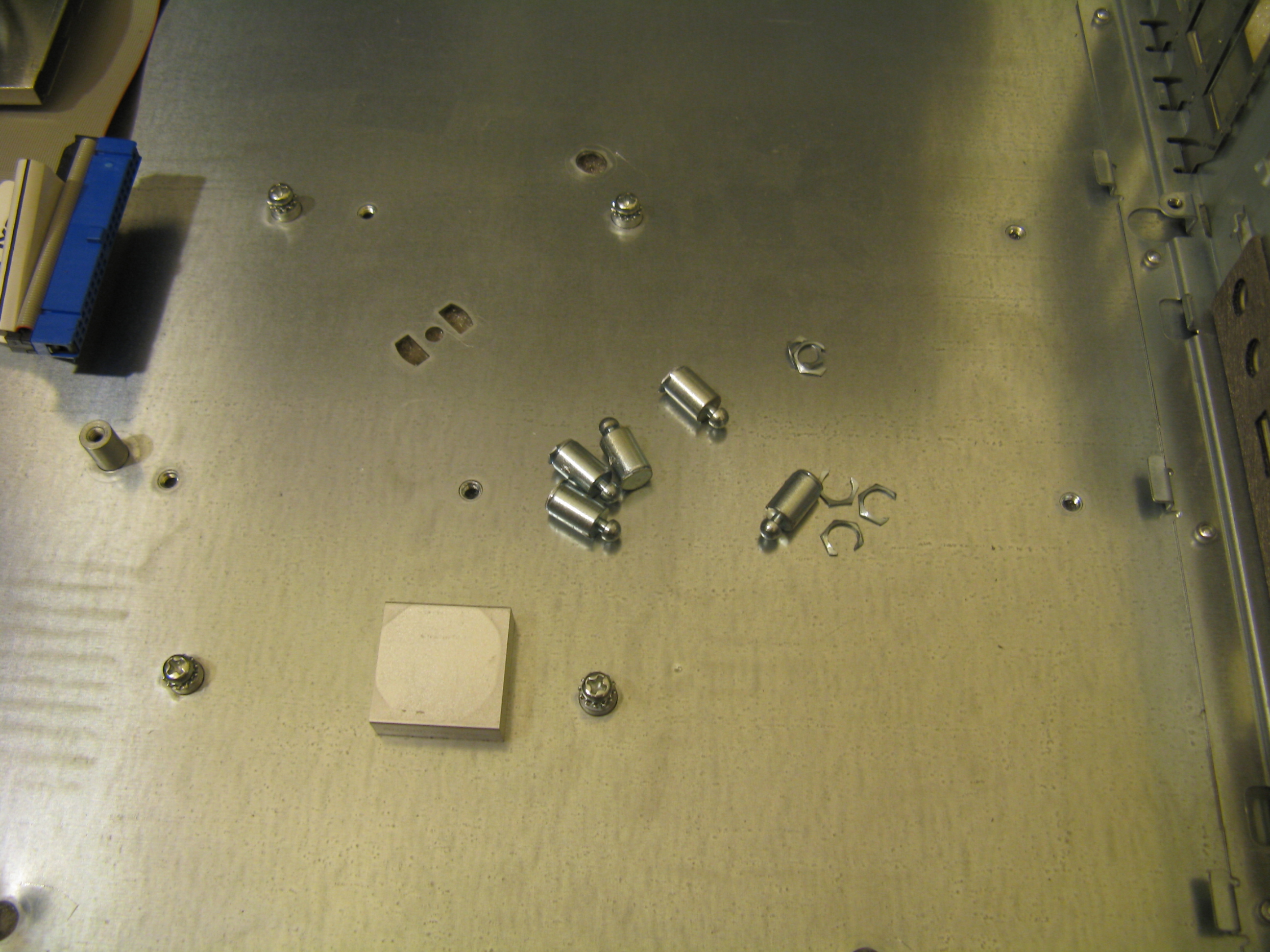 People have used several methods for mounting a new motherboard in a G4. The easiest for me to get was nuts and bolts. The next step is to drill holes for them.