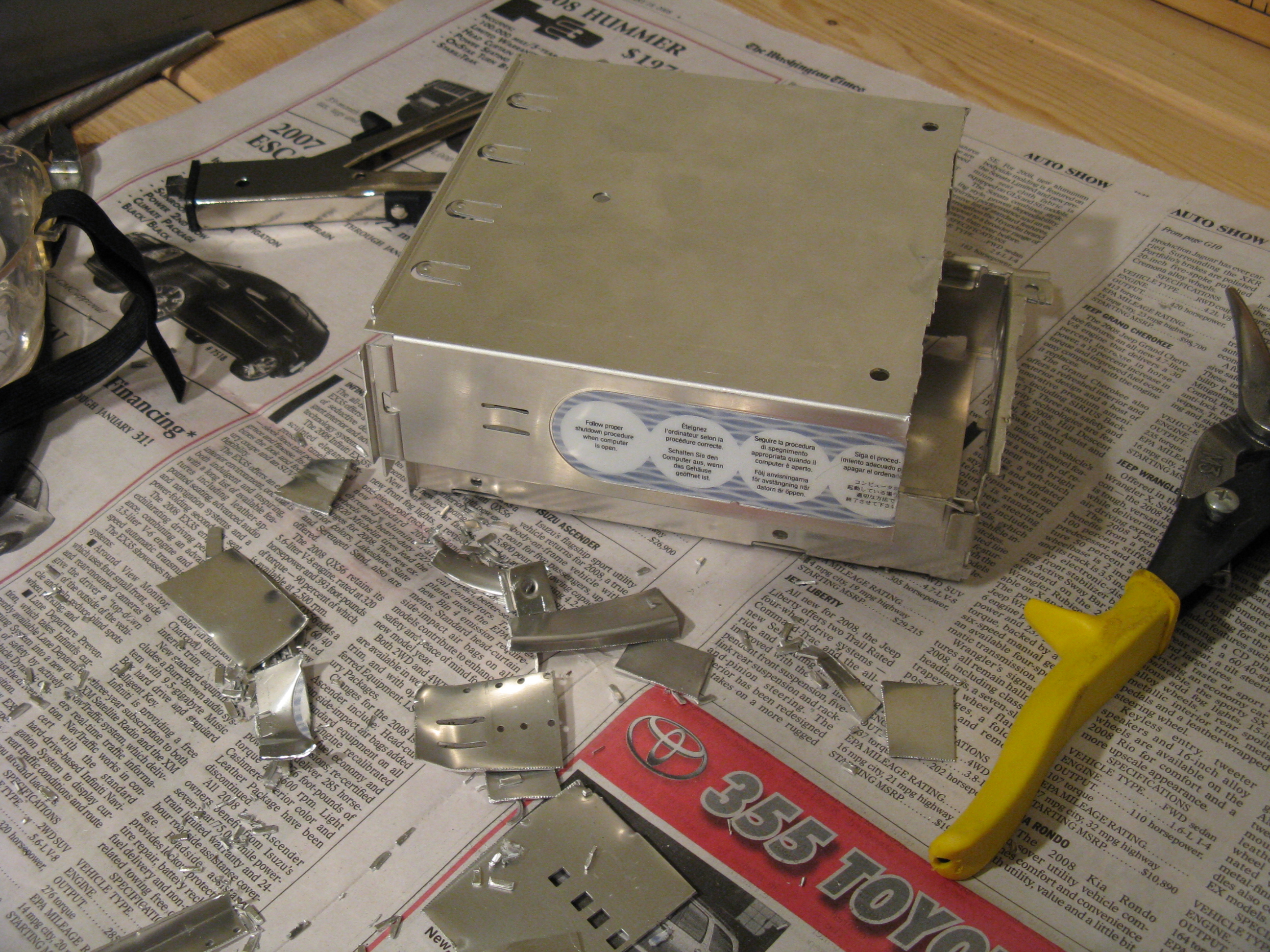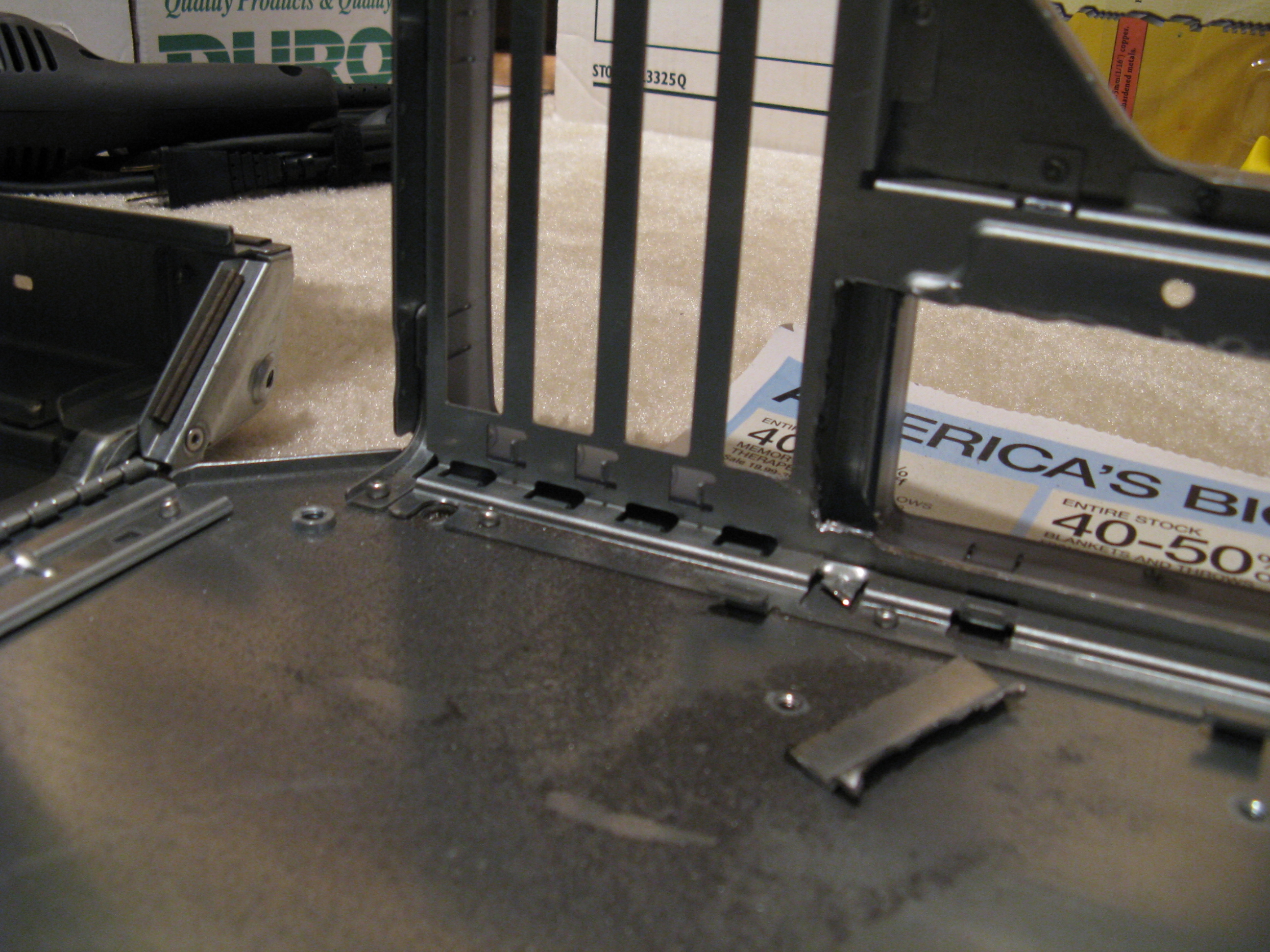 To clear the motherboard, I had to cut a few inches off of the back of the optical drive cage and notch out the shelf that it sits on. I started using metal snips and nibblers, but switched to a jigsaw.