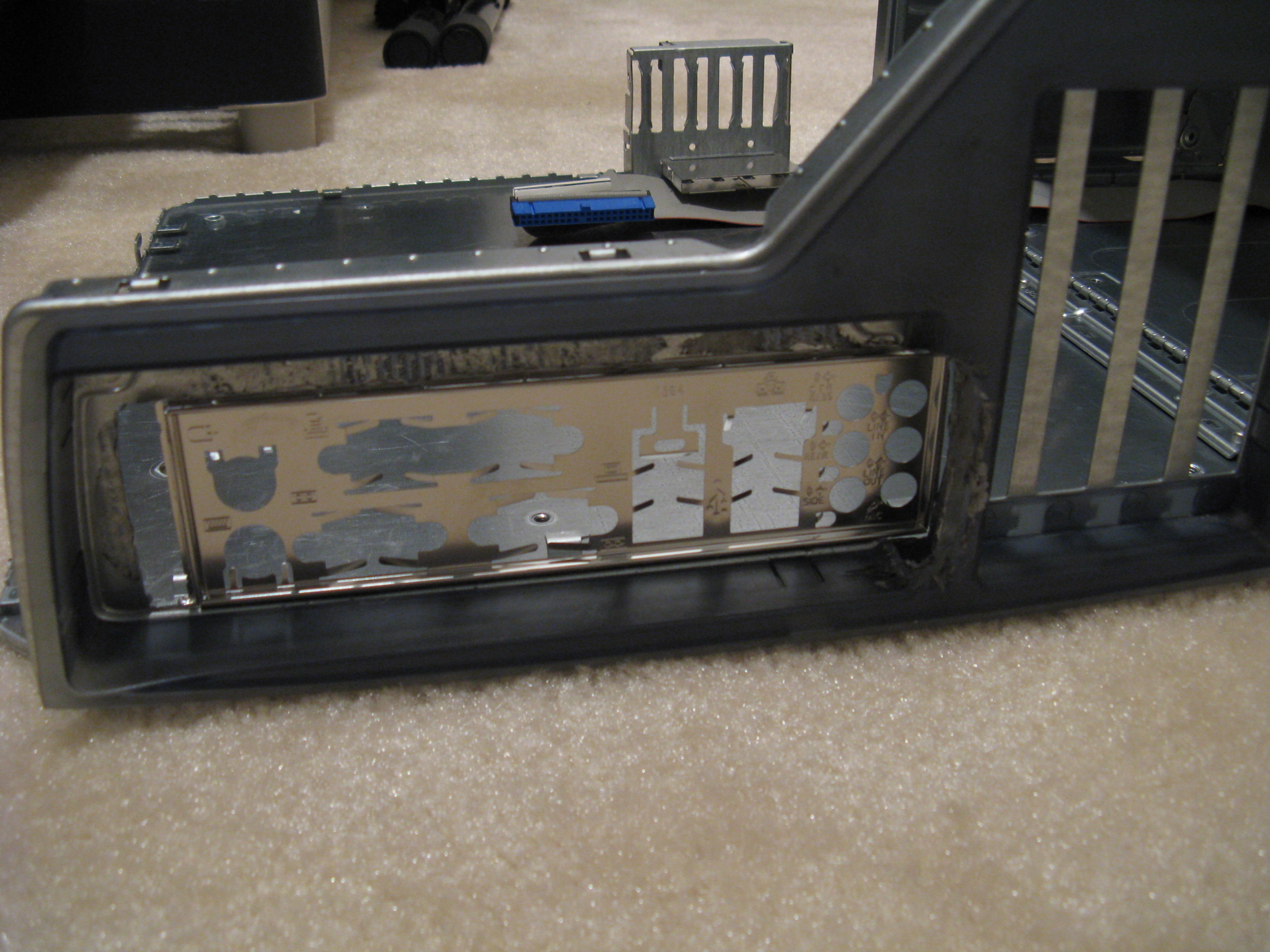 To fit a standard ATX backplate, you need to cut the G4 cover plate out all the way down to the plastic on the side where the bottom of the motherboard is. On the bottom of the hole (with the case closed and upright), you have to cut into the plastic and about halfway through the bar that separates the motherboard cutout from the video card slot. I couldn’t find a neat way to do that, as the angle is awkward. The best tool seems to be a jigsaw.
