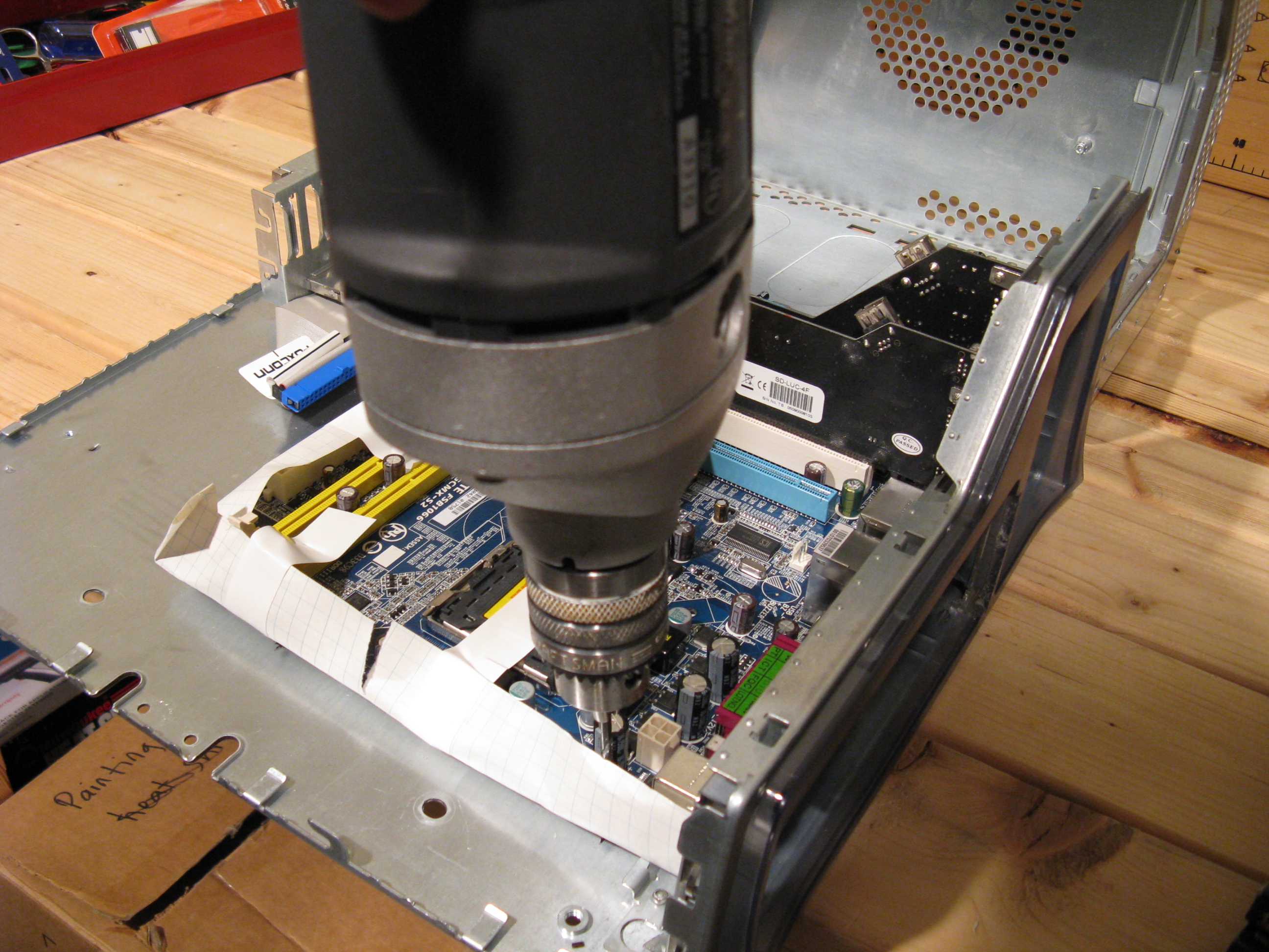 Once you have a big enough hole for the ATX backplate, test-fit the motherboard and screw in at least one expansion card to align it. Mark holes on the case door for new motherboard mounting holes. I had the best success by drilling the holes with the motherboard in place. To be cautious, you can tape paper to the bottom of the motherboard to protect it from debris, or use an old scrap motherboard for the drilling phase.