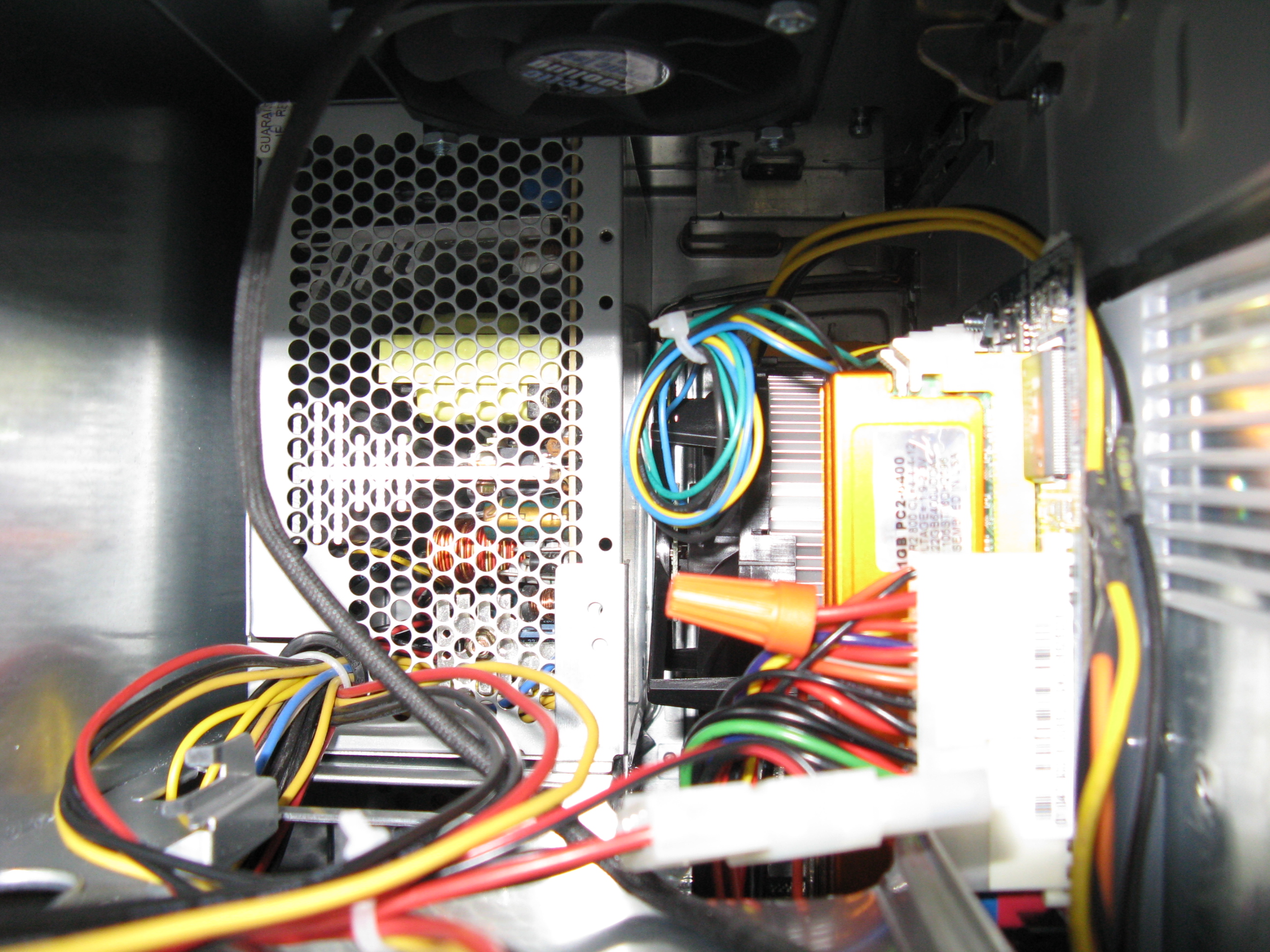 I installed the hard drive on the bracket by the front of the computer, as it is the nearest to the new motherboard’s connectors. A SATA hard drive would have made for neater cable management, but I had an ATA drive that was good enough already, and I wasn’t using the ATA connector for an internal optical drive. I used a shorter ATA cable than it came with, since it didn’t need to reach up to the optical drive bay. Later, after the ATA drive died, I did replace it with a SATA one.