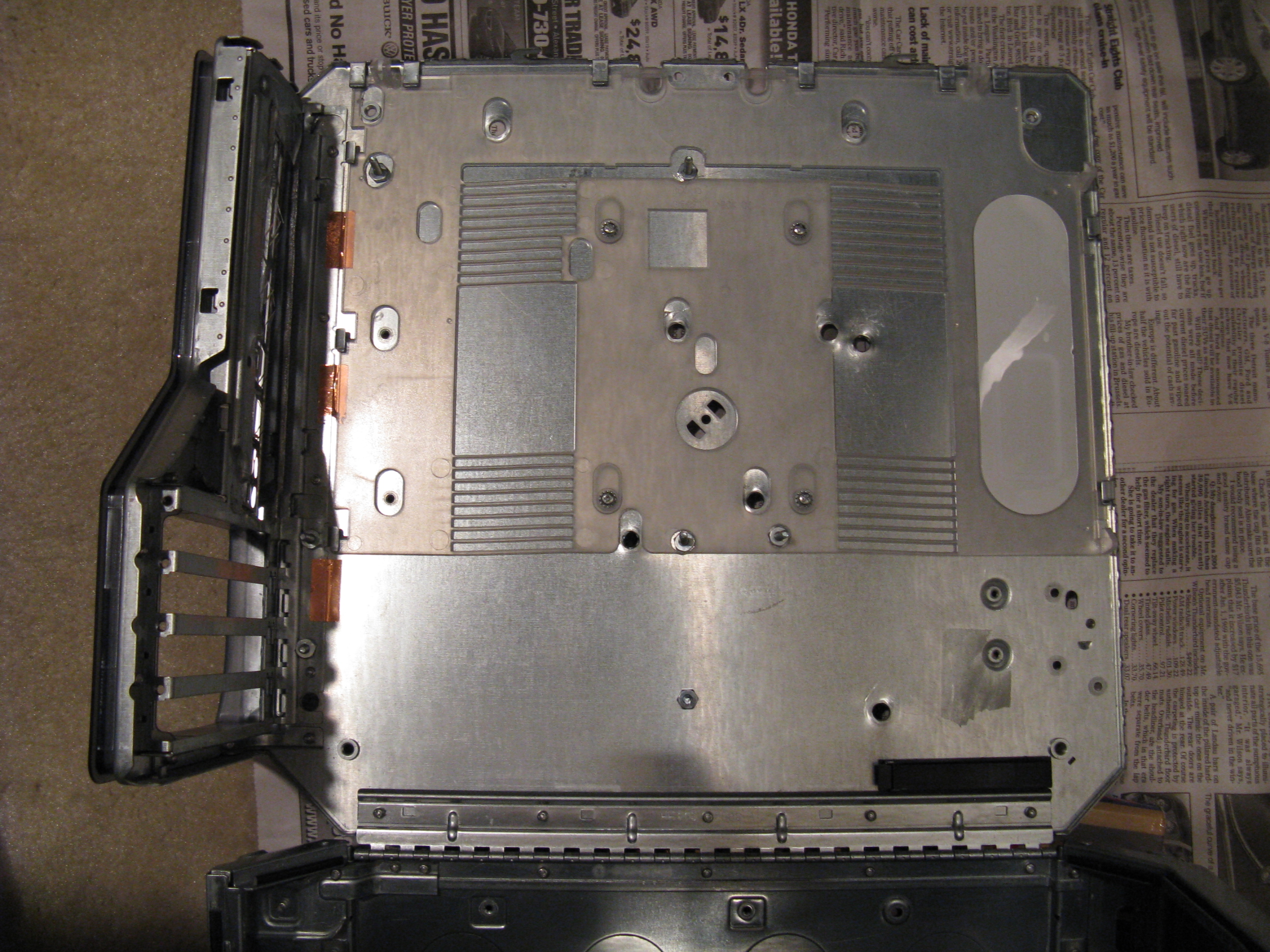 The optical drive door comes out by bending a couple of plastic tabs. Unscrew and remove the expansion cards, optical drive bay, power supply, motherboard (but not yet the plastic hinge sheet under it), 120mm case intake fan and bracket, and hard drive(s) and carriers. Pry the optical drive data cable off of the double-sided foam tape and scrape the foam off with a putty knife and goo remover.