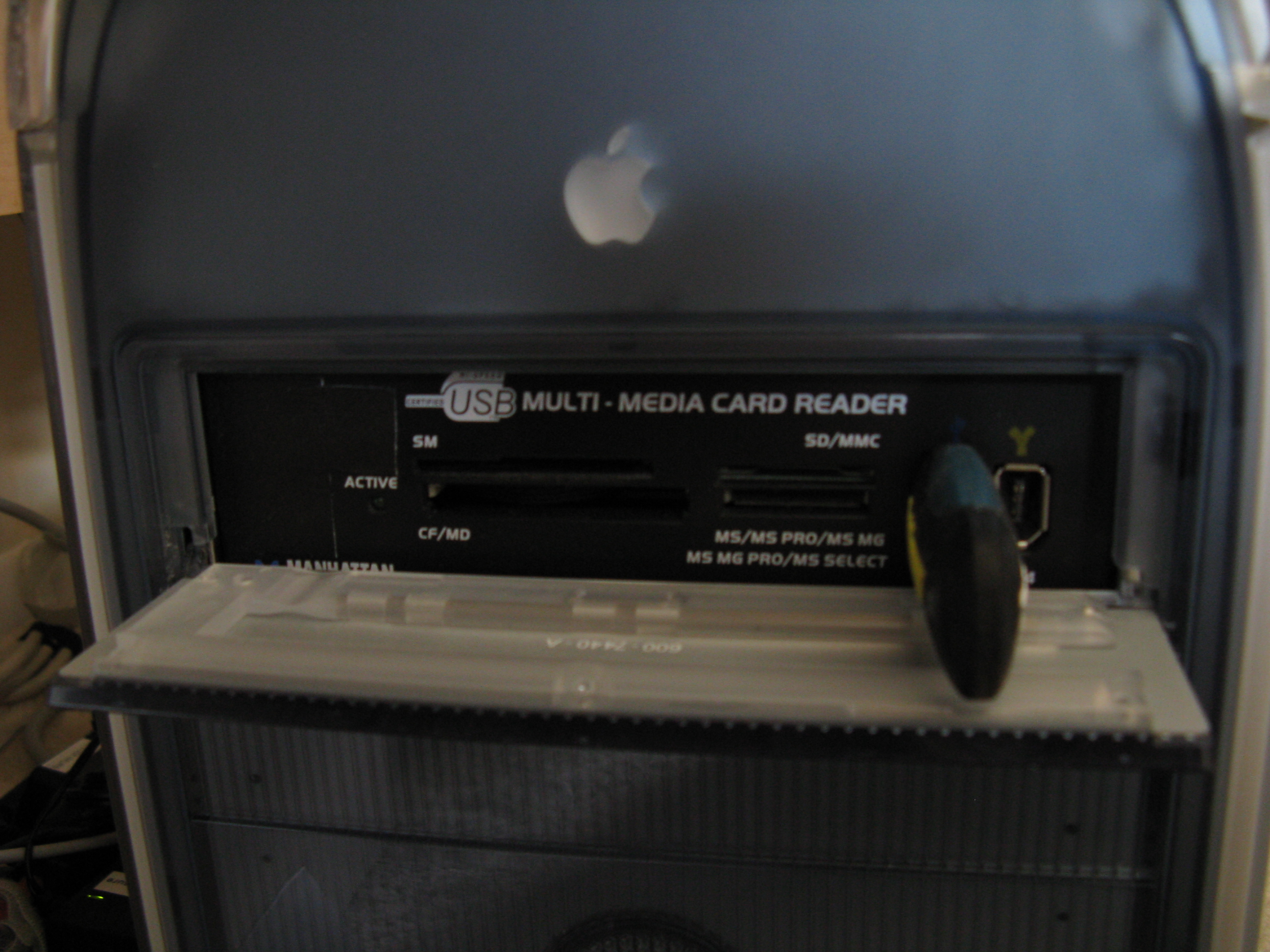 I put a SATA DVD burner in a USB/eSATA enclosure; this motherboard can boot from a USB optical drive. I put a USB/Firewire/flash front ports panel in the computer’s optical drive bay. I had been wanting front ports on the computer anyway, so this was a somewhat elegant solution to two problems at once. The eSATA enclosure is important, as the Apple DVD player only works if you have an ATA or SATA DVD drive installed. I put a SATA to eSATA adapter bracket in the lowest PCI slot.