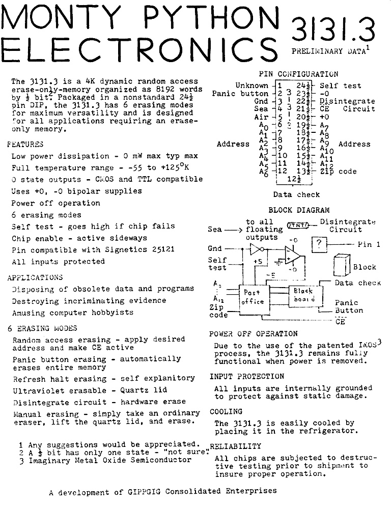 I ran across this data sheet for an imaginary IC at my high school’s computer club in the early 1980s. I never found out who created it. (Click to enlarge.)